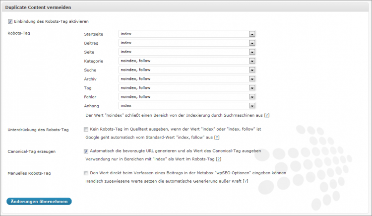 Auf der Optionen-Seite der Erweiterung ("Einstellungen » wpSEO") haben Sie die Möglichkeit sehr viele Einstellungen zu tätigen. Sie haben die Möglichkeit den Aufbau des Seitentitels für Artikel, Seiten, Archive etc. zu steuern, Sie haben die Möglichkeit die Seiten-Beschreibungen und Seiten-Keywords zu steuern, Sie haben die Möglichkeit zu steuern welche Seiten des Weblogs indiziert werden sollen und welche nicht, um so genannten Duplicate Content (identischer Inhalt auf mehreren URLs) zu verhindern und vieles mehr.