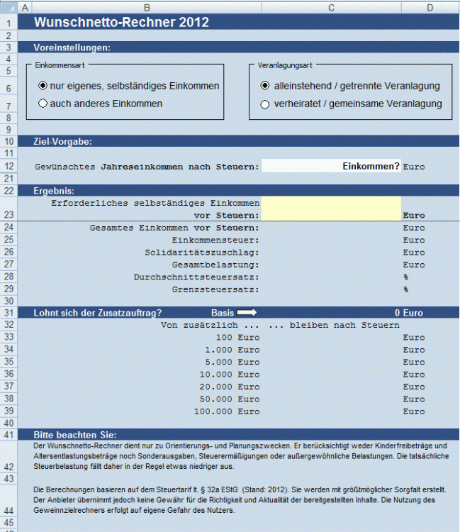 Den Wunschnettorechner finden Sie hier als Excel-Lösung zum Herunterladen. Damit können Sie auch - bei gemeinsamer Veranlagung - das Einkommen Ihres Ehepartners gleich miteinberechnen oder aber das Zusatzeinkommen aus einem Angestellten-Job . Und natürlich können Sie die Ergebnisse für verschiedene Zielwerte speichern.