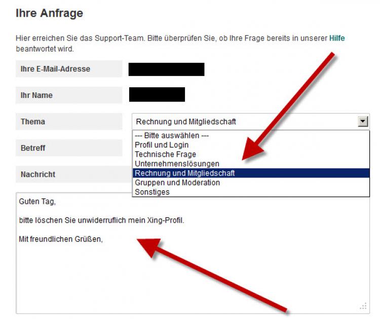 Geben Sie einen kurzen Text ein, bspw. "Guten Tag, bitte löschen Sie unwiderruflich mein Xing-Profil. Mit freundlichen Grüßen, XYZ", und senden Sie das Formular ab.