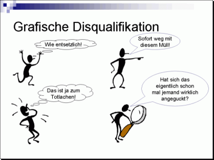 Zum Stil einer Präsentation gehören außer dem allgemeinen Design auch die auf den jeweiligen Folien eingesetzten Grafiken. Es ist erstaunlich, mit welcher Gnadenlosigkeit heute noch überall die "Bohnenmännchen" eingesetzt werden. Die sind nicht nur völlig lieblos gezeichnet, sondern inzwischen dermaßen oft benutzt worden, dass es schon weh tut.