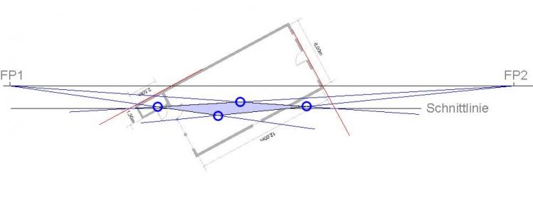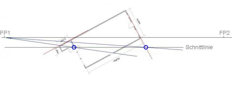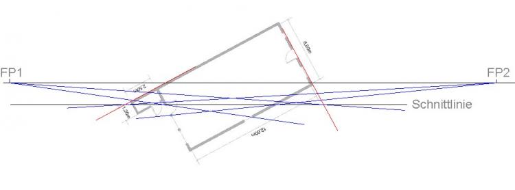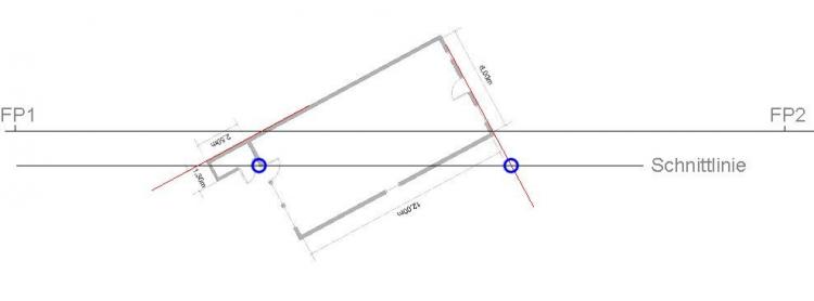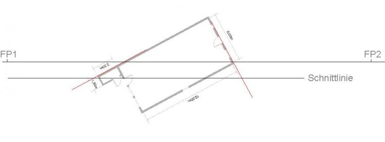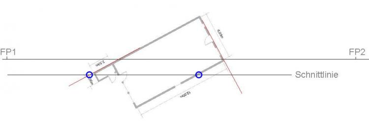 Grundrisslinie evtl. bis zur Schnittlinie verlängern (siehe rote Linien an der Hinterkante des Hauses), ...